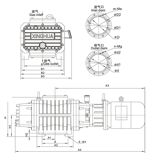 | Model | A | A1 | A2 | A3 | A4 | B | B1 | B2 | B3 | H | H1 | H2 | D | D1 | D2 | d | d1 | d2 | m | n | e | g | k |