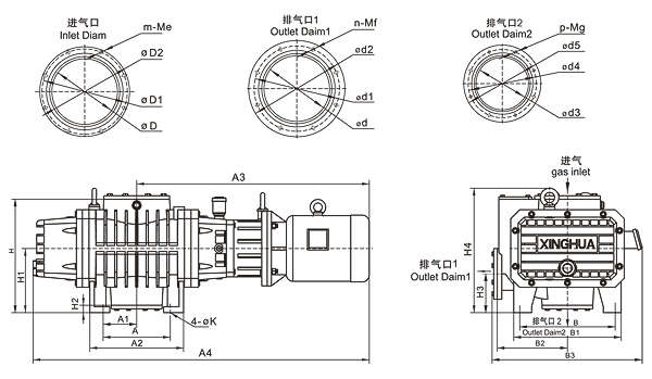 | Model | A | A1 | A2 | A3 | A4 | B | B1 | B2 | B3 | H | H1 | H2 | H3 | H4 | D | D1 | D2 | d | d1 | d2 | d3 | d4 | d5 | m | n | p | e | f | g | k |