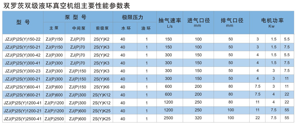 單羅茨雙級液環(huán)真空機組主要性能參數(shù)表